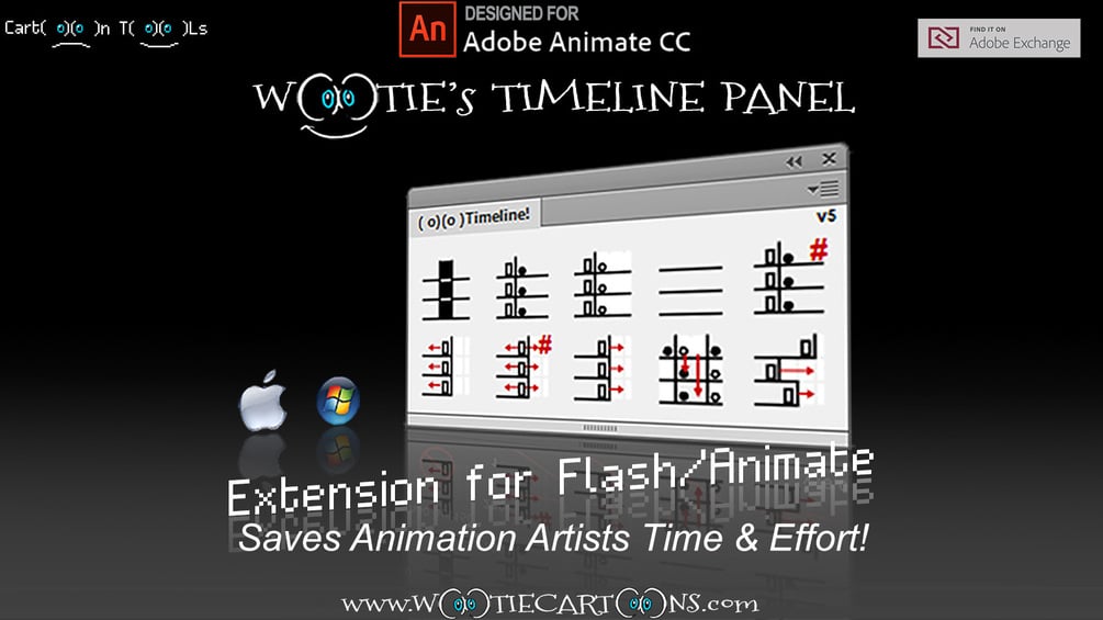 W( o)(o )tie's time saving Flash tools improve cart( o)(o )n crafting. They are software extensions, or plugins, for your existing Flash program(for all versions of Flash, 8 through CC). After a simple double click to install, open Flash and they appear as Panels of commands, that are accessed by clicking 'Window/Other Panels', and are then dock-able along the side of the stage. All these commonly used Flash Cart( o)(o )n Animation commands, brilliantly eliminate the pain of many little steps an animator is forced to take for a simple task, by making them into 'one-click-does-it-all' command. W( o)(o )tie has 20 years experience in the Vancouver animation industry so knows exactly what a Flash animator loves, hates and needs. Both colours of skins included. Light grey skin(classic Macromedia style) or Black skin (new Adobe style).